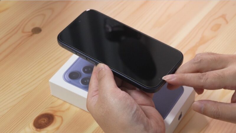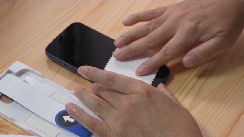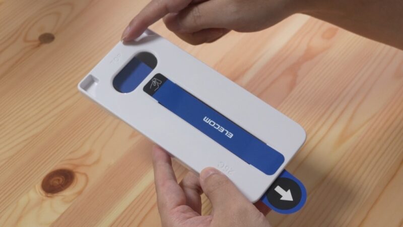 中央の青い部分を押し込むように数回スライドします。その後、人差し指でフィルム(黒い部分)を押さえながら青いシールを剥がします。ここまでできたら、貼り付けツールは取り外してしまってOKです。