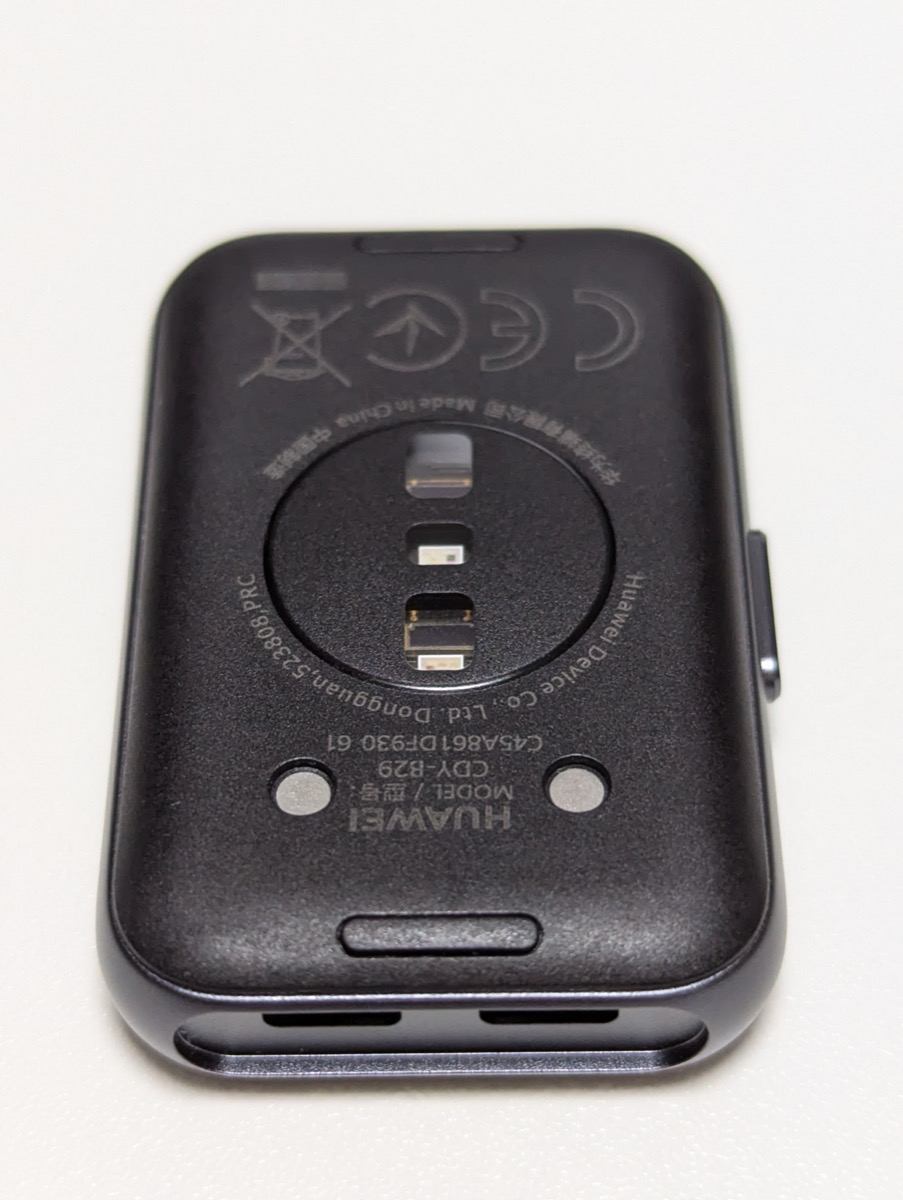 1. スマートバンド本体の背面を確認すると、丸い接点(ポチ)が2つあります。