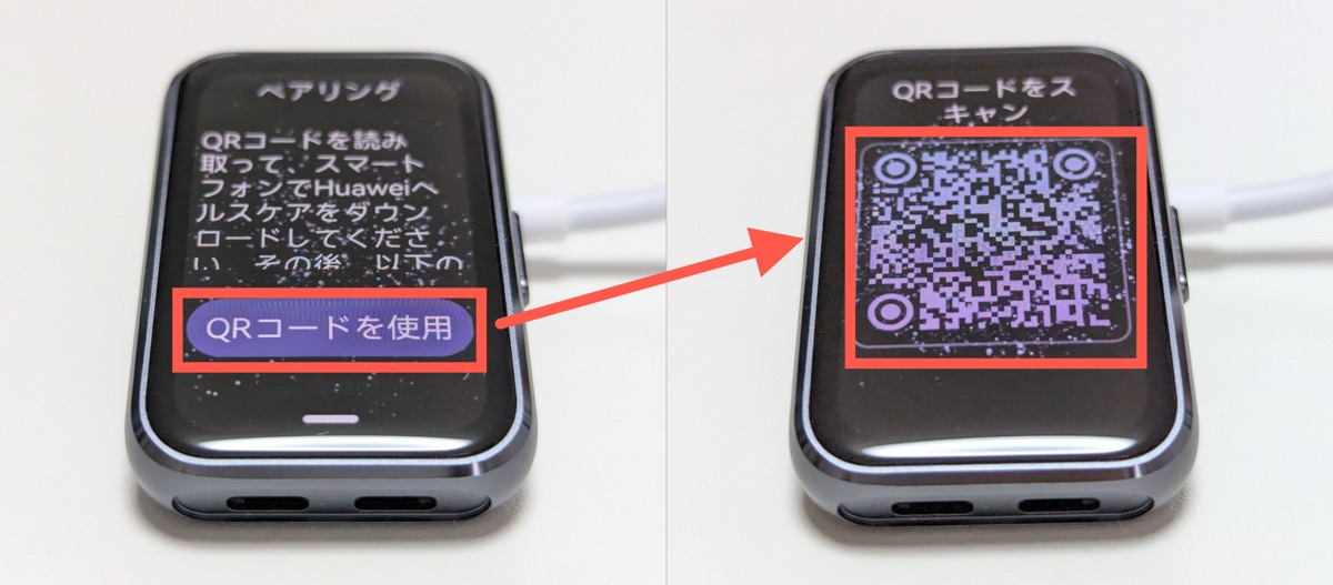 言語を選択すると、スマートバンドの画面に「QRコードを読み取ってスマートフォンでHUAWEIヘルスケアをダウンロードしてください」というメッセージが表示されますので、次の手順で操作してください。