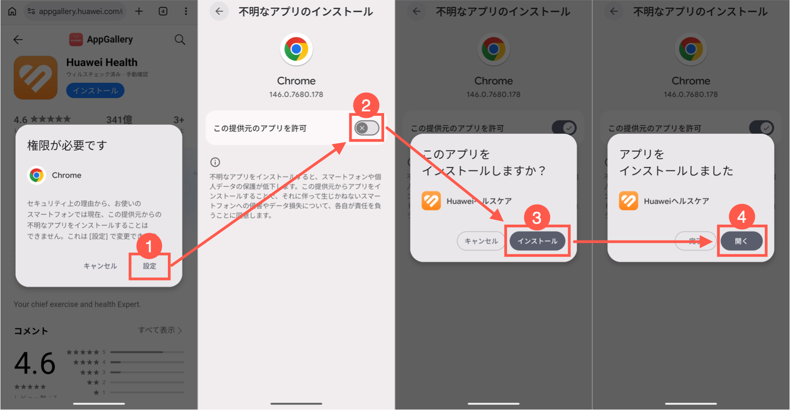 HUAWEIヘルスケアアプリをインストールするため「不明なアプリのインストール」を許可しました。これは、元の状態に戻しておいた方がいいです。やり方は簡単です。ホーム画面などでChromeのアイコンを長押し → アプリ情報 → 不明なアプリのインストール → 無効化。これで元の状態に戻せます。