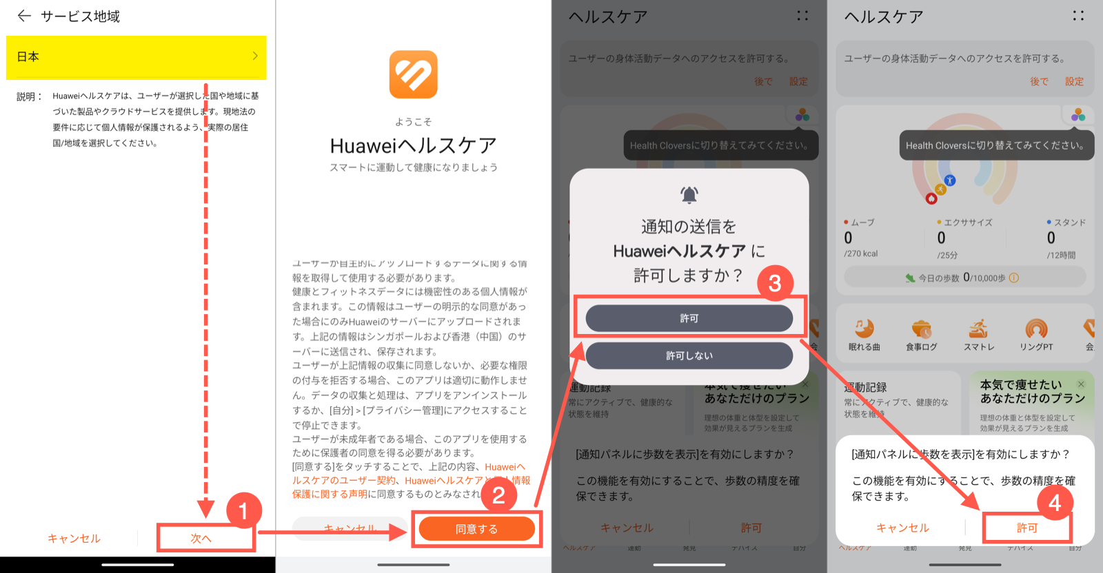 4. 歩数の通知パネル表示:通知パネルに歩数を表示するかどうか聞かれます。有効にすると歩数の精度が確保できるとのことなので、「許可」をタップしておくのがおすすめです。