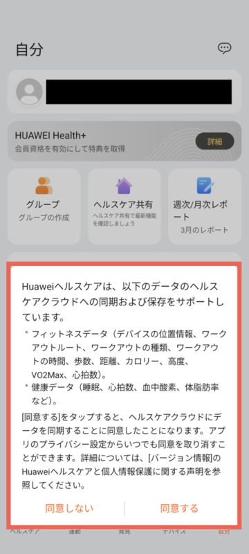 続けて、健康管理データやワークアウトデータをクラウドに保存するかどうかの確認画面が出ます。バックアップとしてHUAWEIのクラウドに保存したい場合は「同意する」を、保存したくない場合は「同意しない」をタップしてください。
