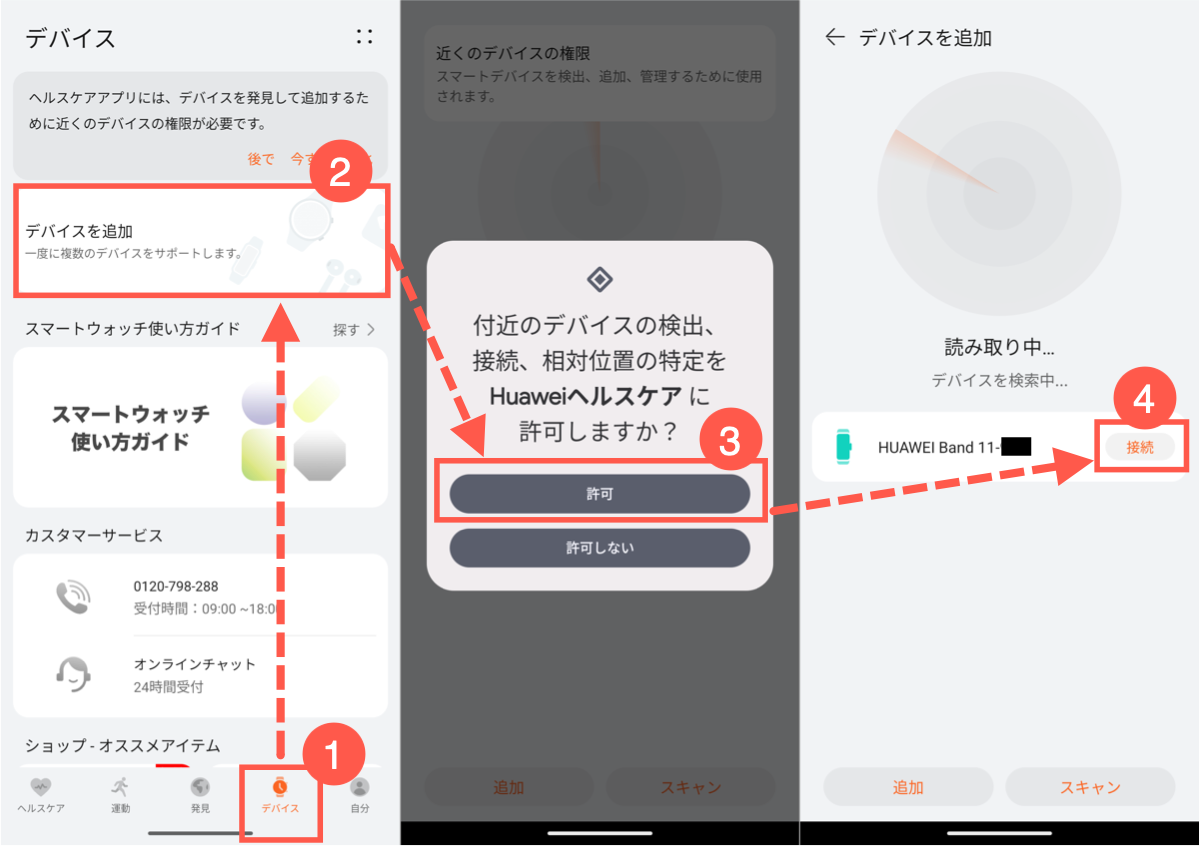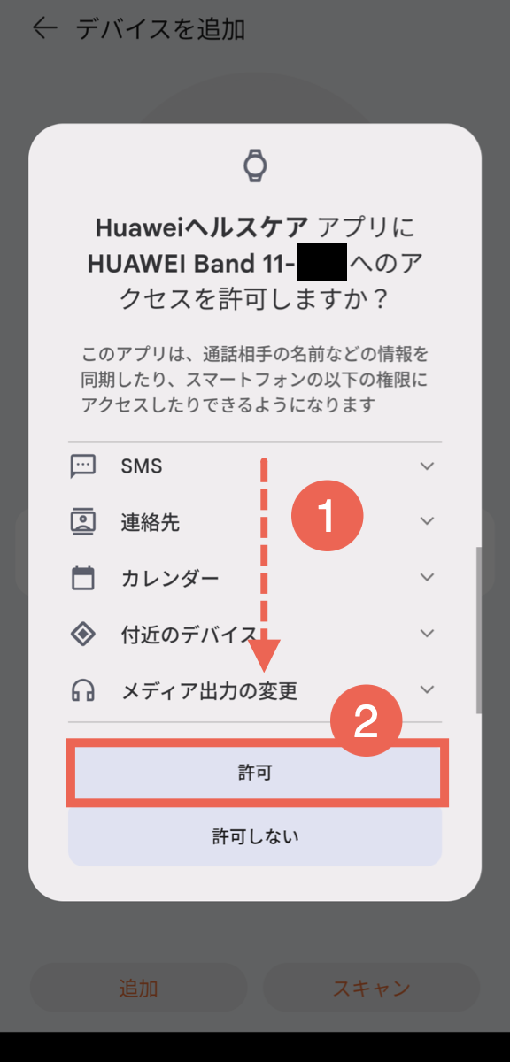 接続をタップすると、HUAWEIヘルスケアアプリがHUAWEI Band 11にアクセスするための権限の許可を求められます。下にスクロールして[許可]をタップします。