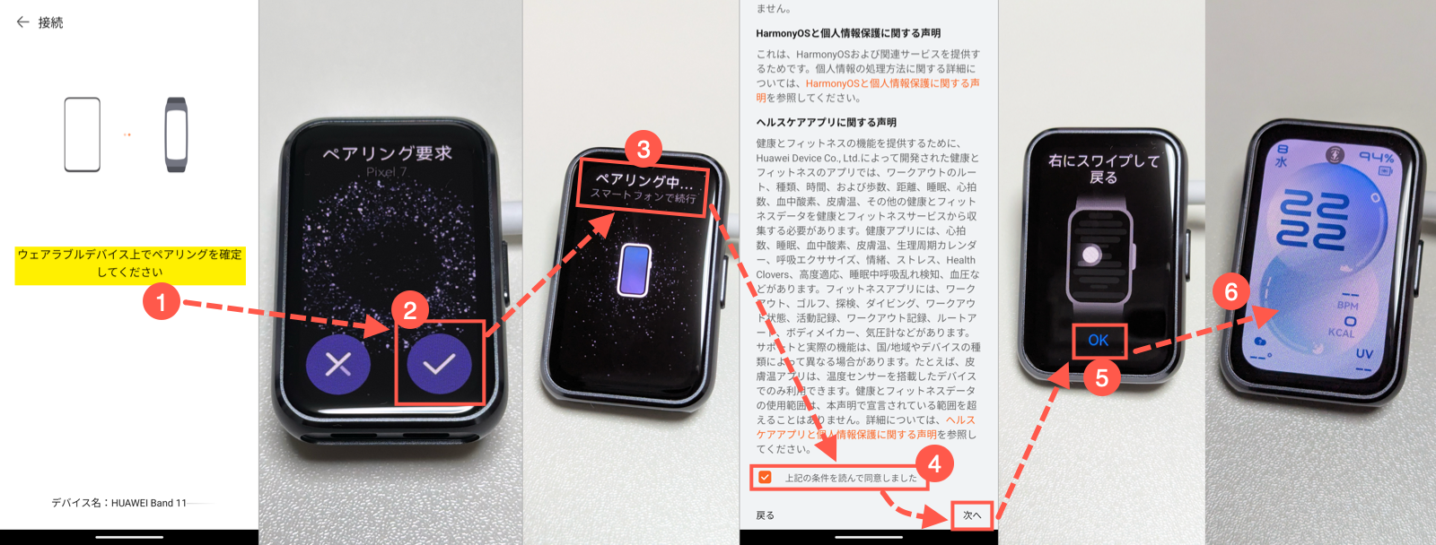 1. 「ウェアラブルデバイス上でペアリングを確定してください」と表示されたら、