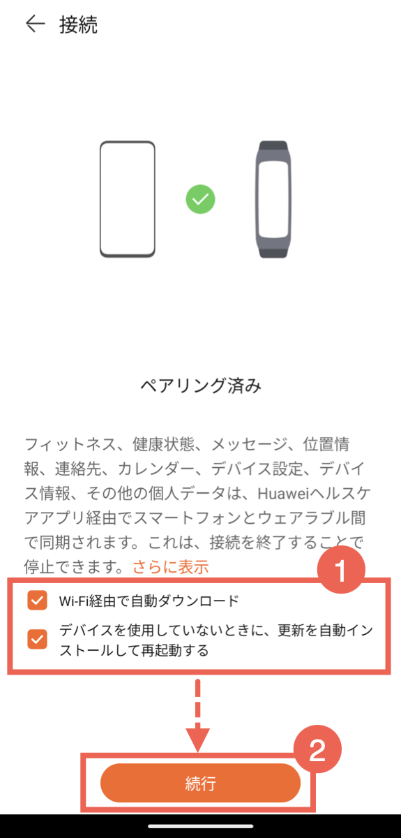 ペアリング完了後、自動更新に関する設定画面が表示されます。以下の2つのチェックボックスが初期状態でオンになっています。