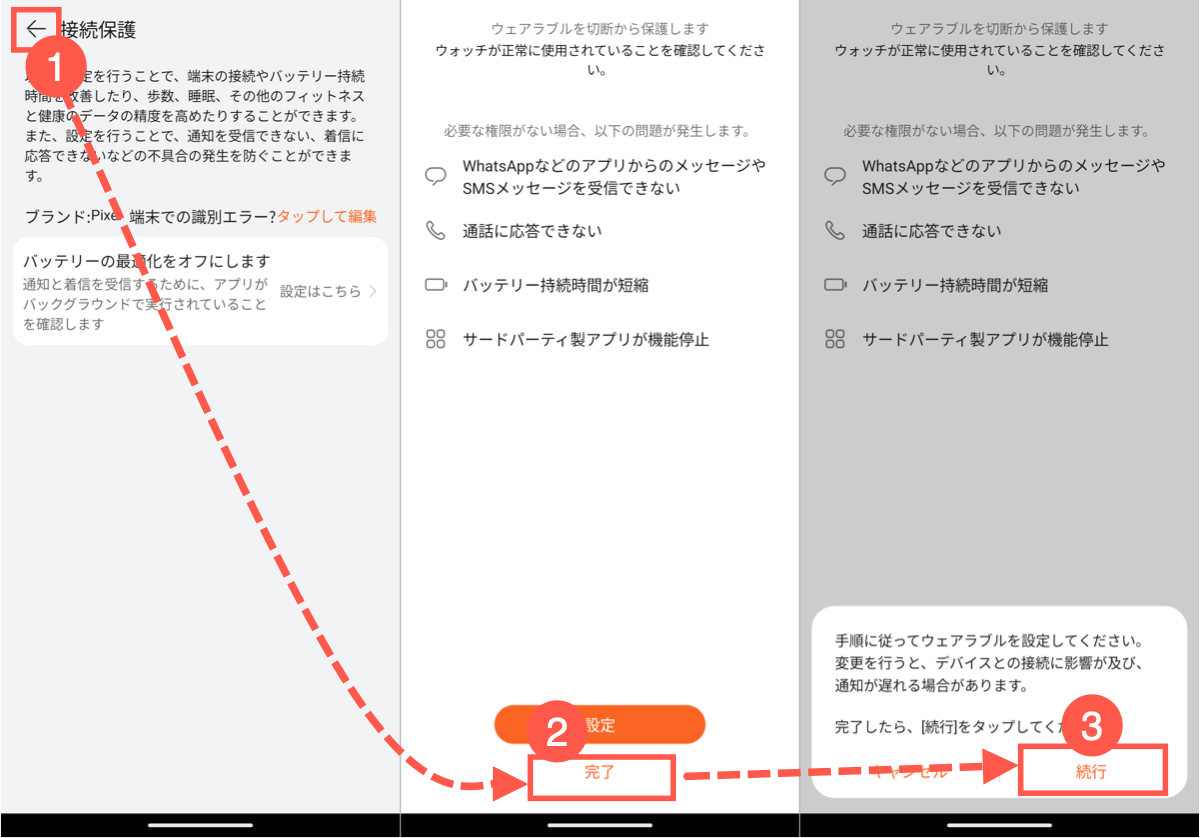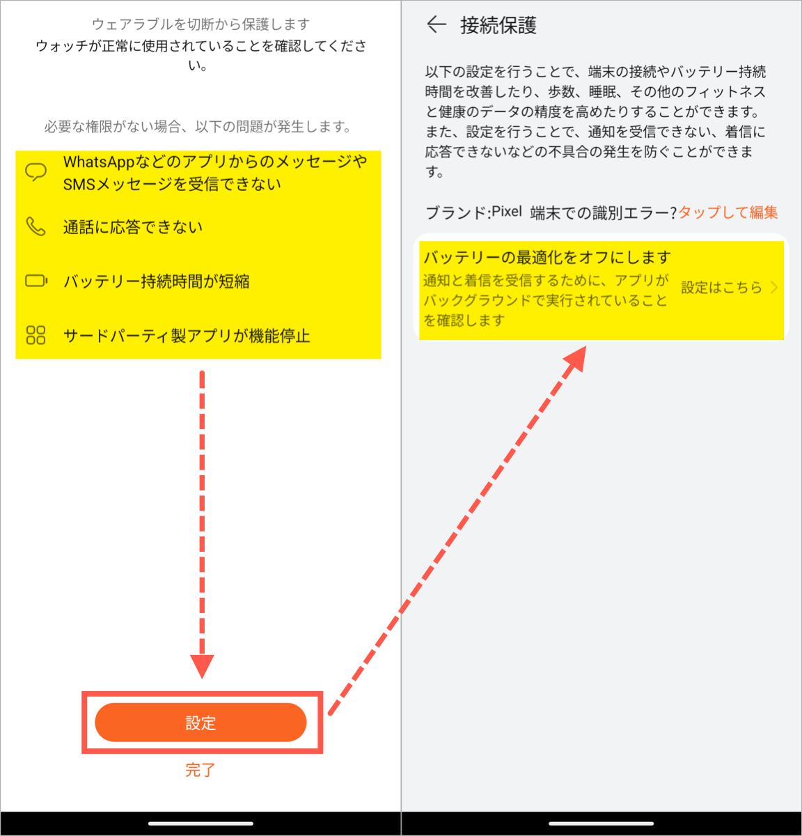 画面下の「設定」ボタンをタップすると、バッテリー最適化に関する説明が表示されます。Google Pixelの場合、HUAWEIヘルスケアアプリがバックグラウンドで動作できるように、バッテリーの最適化をオフにする必要があります。ただ初期状態でオフになっているので何もしなくてもOKです。