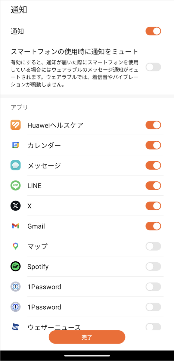 通知の設定画面が表示されます。ここでは、スマートバンドで通知を受け取りたいアプリを有効にし、反対に通知が不要なアプリを無効にします。設定が終わったら「完了」ボタンをタップします。