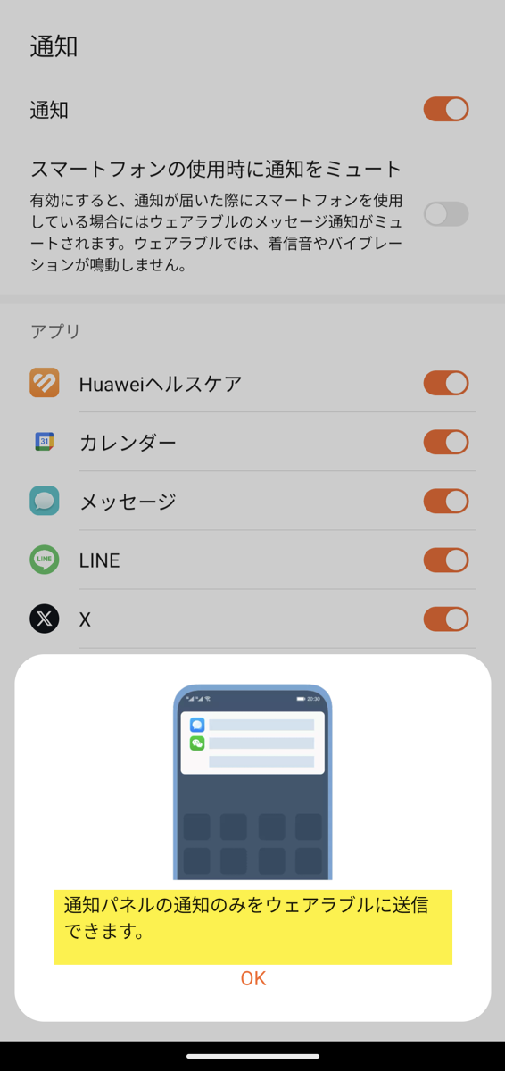 「通知パネルの通知のみウェアラブルに送信できます」という注意画面が表示されます。