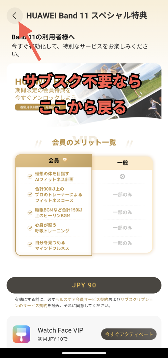 通知機能の設定後、下の画像のようなHUAWEIのサブスクリプション画面が表示される場合があります。不要であれば左上の「戻る」ボタンで戻ればOKです。