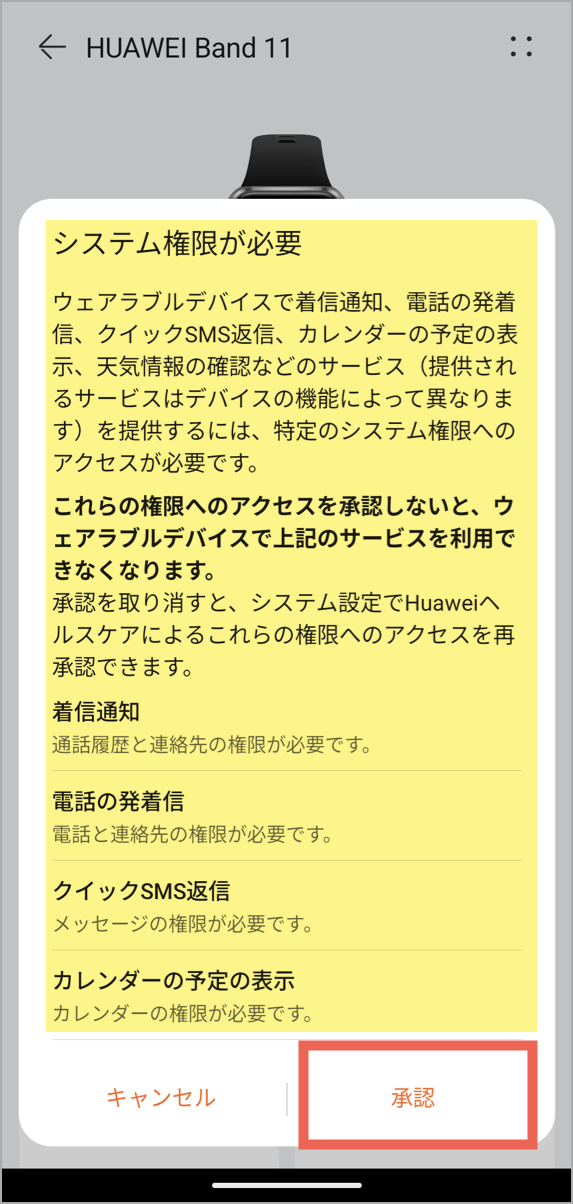 続いて「システム権限が必要です」という画面が表示されます。スマートバンドの通知機能、返信機能、カレンダー予定の表示、天気情報といった機能を利用するには、以下のシステム権限が必要です。