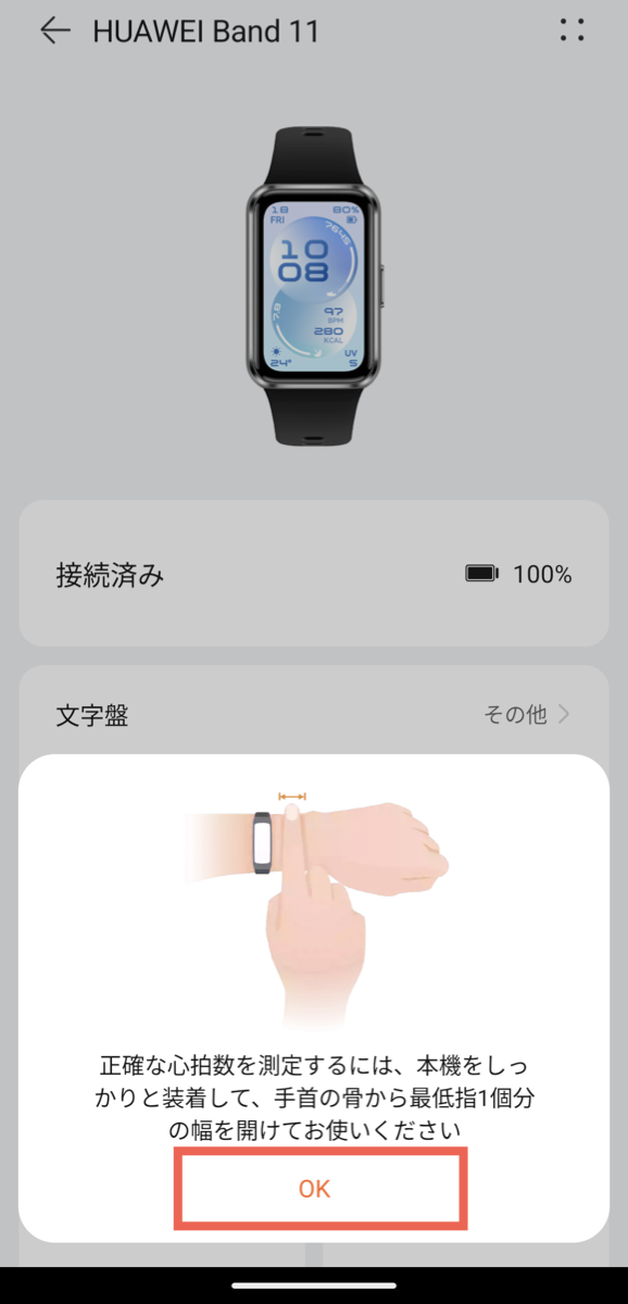 その後、バンドの正しい装着方法の説明が表示されるので、内容を確認して「OK」をタップします。