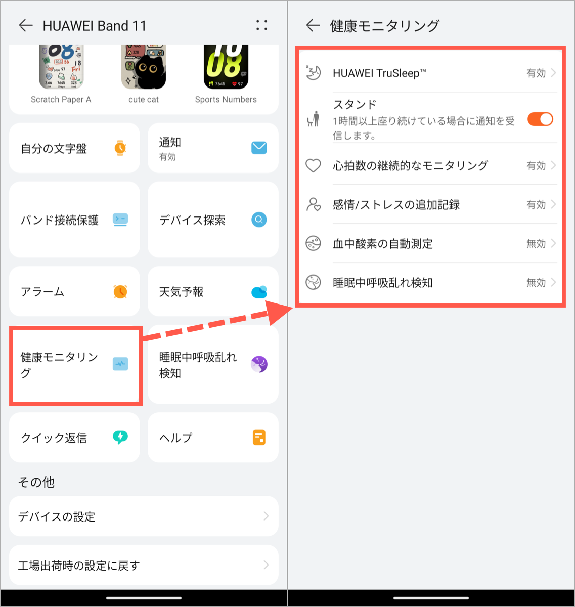 通知の設定や健康モニタリングの各項目は、HUAWEIヘルスケアアプリからいつでも変更できます。「デバイス」タブからHUAWEI Band 11を選択すると、通知設定や健康モニタリングの設定メニューにアクセスできます。