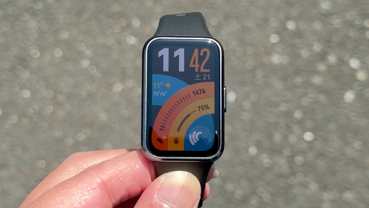 1.62インチのAMOLEDディスプレイは、前モデル(HUAWEI Band 10)から表示領域が約27%拡大しました。最大輝度は約1,500nitで、晴天の直射日光下でも問題なく視認できます。