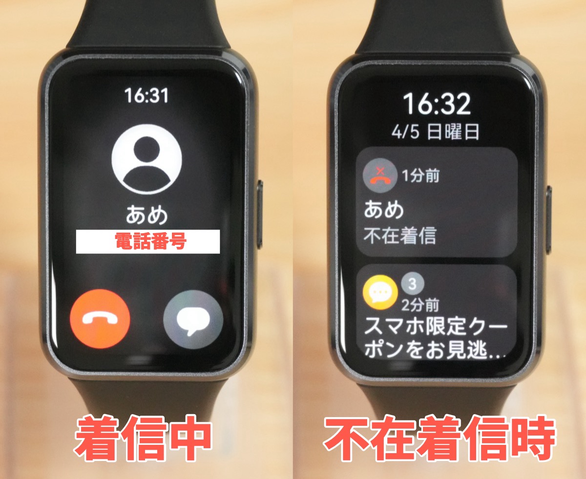 着信通知: 電話着信時にはバンドが振動し、相手の情報が表示されます。バンド側から着信拒否も可能です。吹き出しアイコンをタップして定型文で返信することもできます(着信中は振動し続けます)。