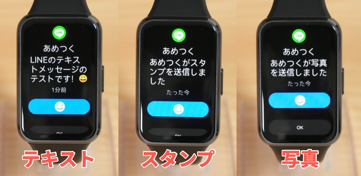 LINE通知: テキストメッセージはしっかり内容が表示されます。スタンプや写真を受信した場合は「スタンプを送信しました」「写真を送信しました」という表示になり、内容の確認にはスマホが必要です。