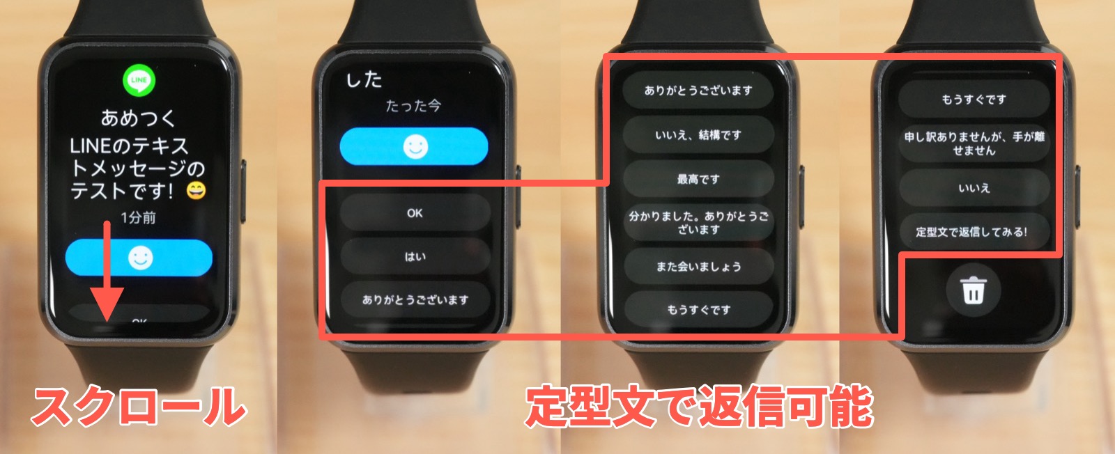 LINE返信:定型文での返信も可能です。定型文はHUAWEIヘルスケアアプリから自由に作成・編集できます(文字数制限あり)。