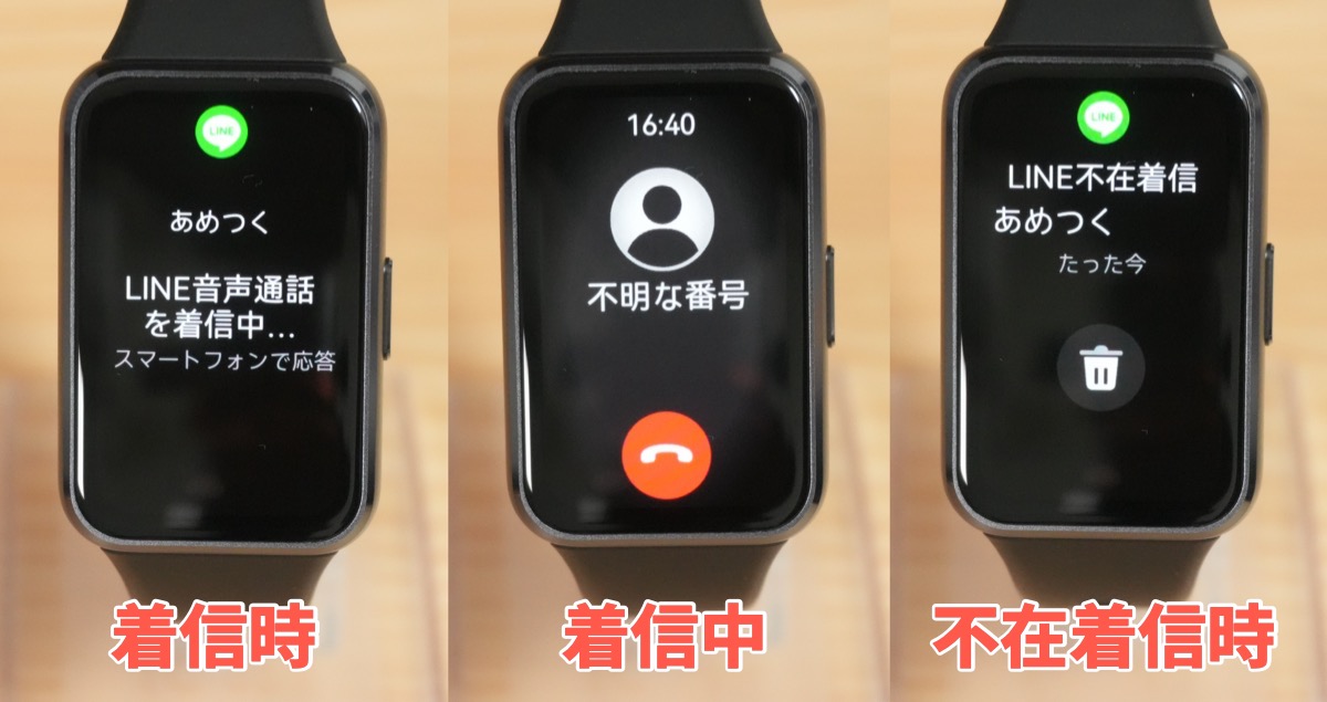 LINE通話の着信(⚠ 注意点あり): 着信時に一瞬だけ相手の名前が表示されますが、すぐに「不明な番号」という表示に切り替わります。着信中はバイブレーションが続くので通知自体には気づけますが、最初の表示を見逃すと誰からの連絡か分からず、結局スマホで確認することになります。なお、電話アプリの着信ではこの問題は発生しません。