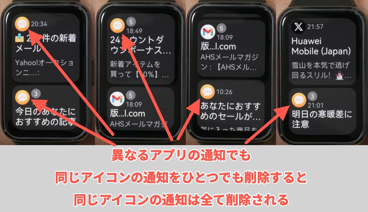 さらに注意が必要なのが、汎用アイコンで表示される通知は、どれか一つでも削除すると、同じアイコンで表示される他のアプリの通知もまとめて削除されてしまうという点です。異なるアプリの通知であっても、汎用アイコンで表示されるものは「同じアプリ」として扱われてしまうようです。