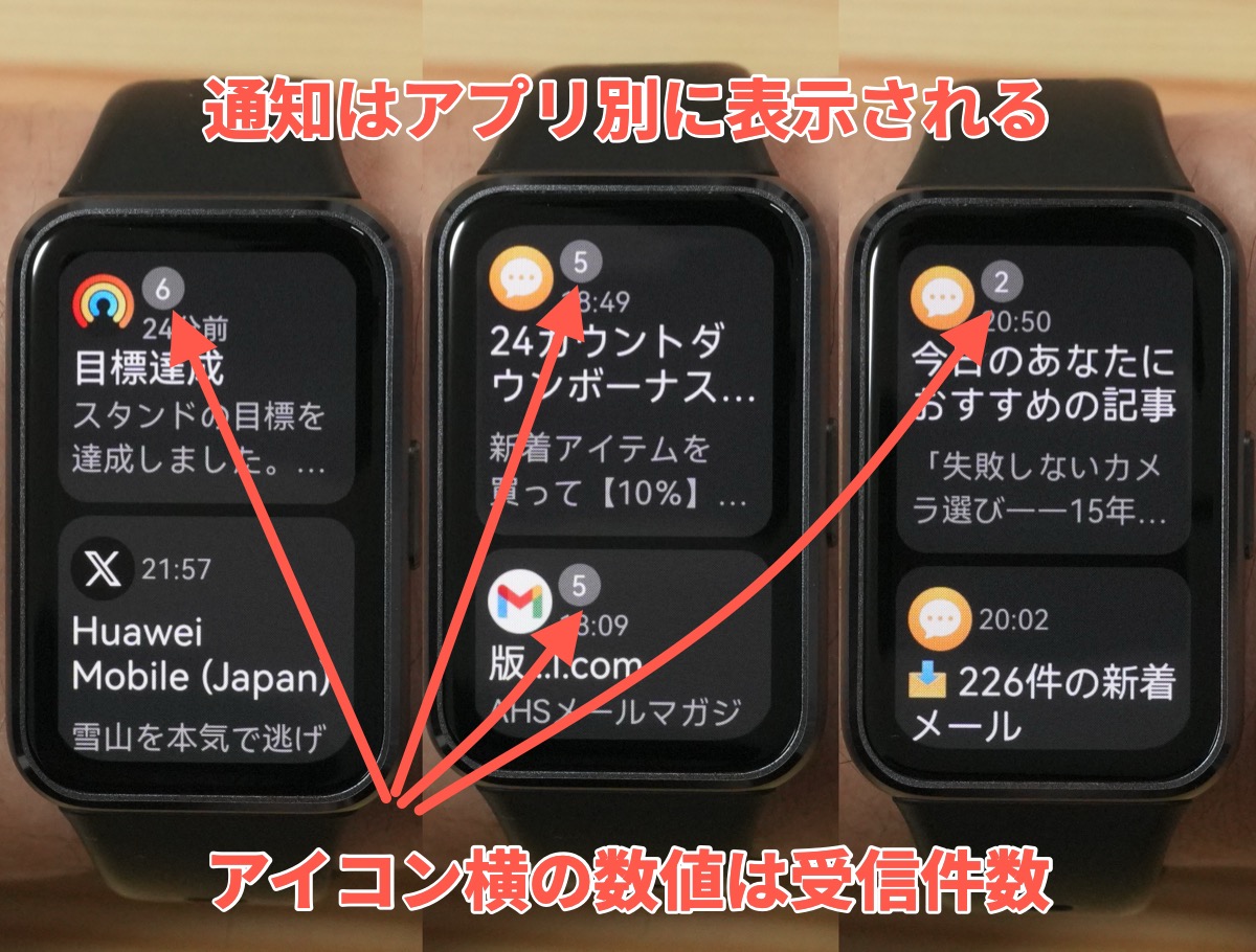 LINE・電話・Gmailなど、アプリ通知が手元で確認できます。通知はアプリ別に表示され、受信件数も確認可能です。