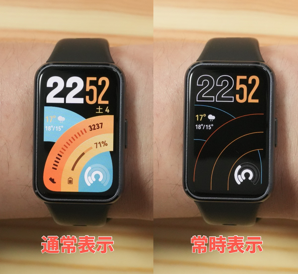 AOD(常時表示)に対応しており、腕を持ち上げなくても時刻を確認できます。ただし、AODを有効にするとバッテリー消費が大きくなります(実測データは後述)。