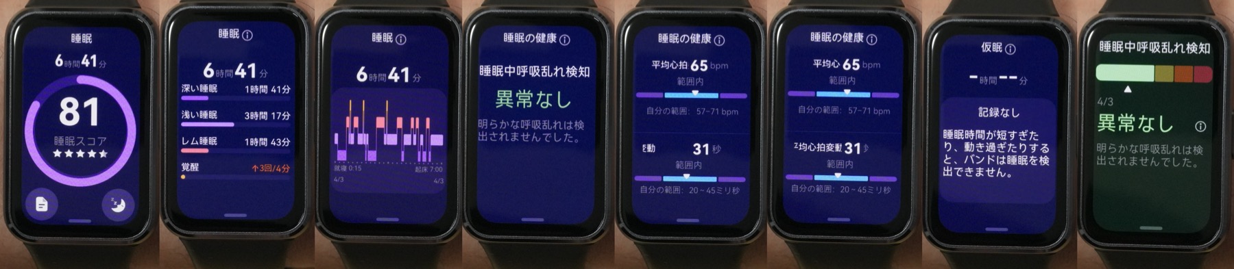 深い睡眠・浅い睡眠・レム睡眠・覚醒を自動で記録し、バンド本体で確認したり、HUAWEIヘルスケアアプリで詳しいデータを管理したりすることができます。睡眠中の呼吸乱れ検知にも対応しています。