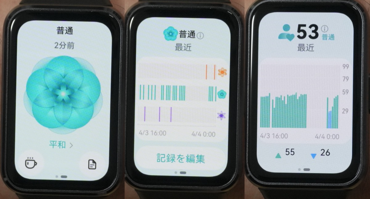 画面の表示とバイブレーションに合わせて呼吸を整える機能で、エクササイズ後には心拍数や実施時間が記録されます。