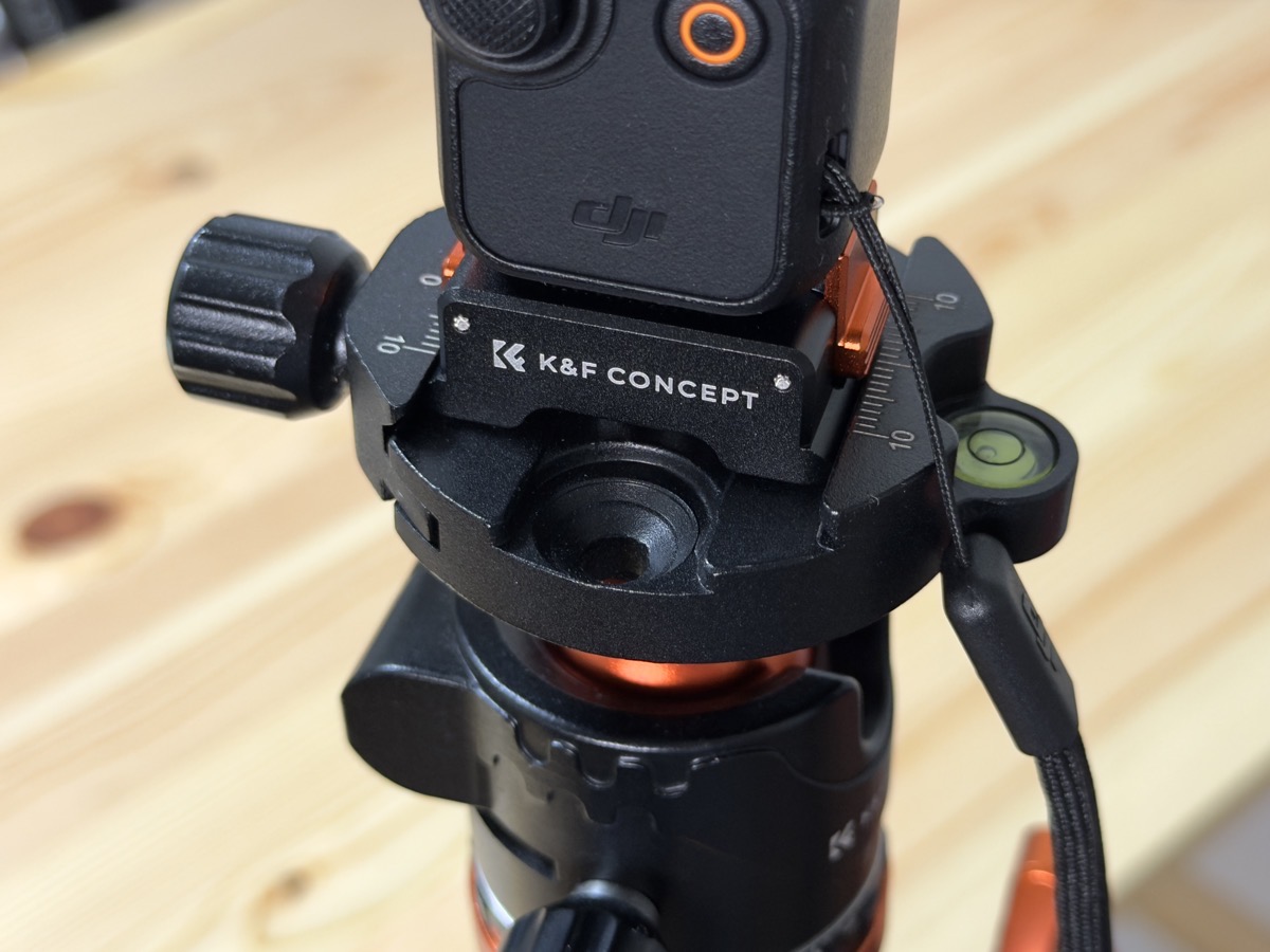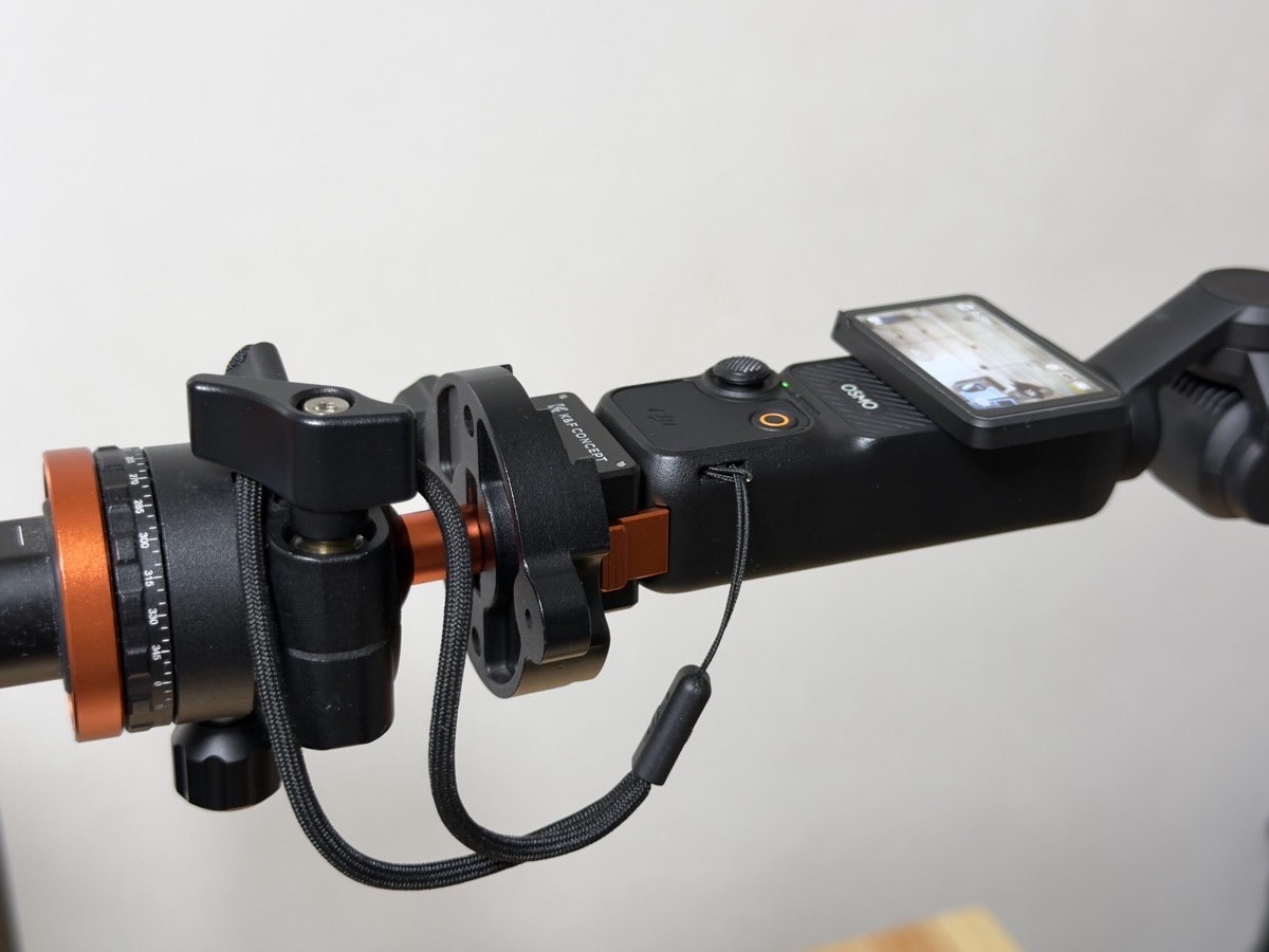 普段、同じメーカー(ブランド)の三脚を使用しているのですが、今回購入した製品は、オズポケ3に取り付けたまま三脚に取り付けられるそうで、下の画像のように三脚に取りけられました。便利です。